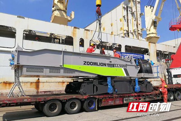 中联重科自主研发生产ZCC5000履带起重机离开上海港,发往印度尼西亚。