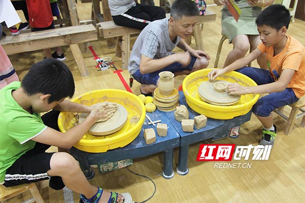 活动现场,小朋友正在和家人一起做拉坯机体验
