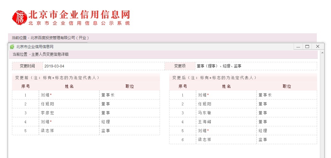 来自北京市企业信用信息网消息显示,近日,北京百度投资管理有限公司发生工商信息变更,李彦宏卸任董事,马东敏、王海峰成为新任董事。