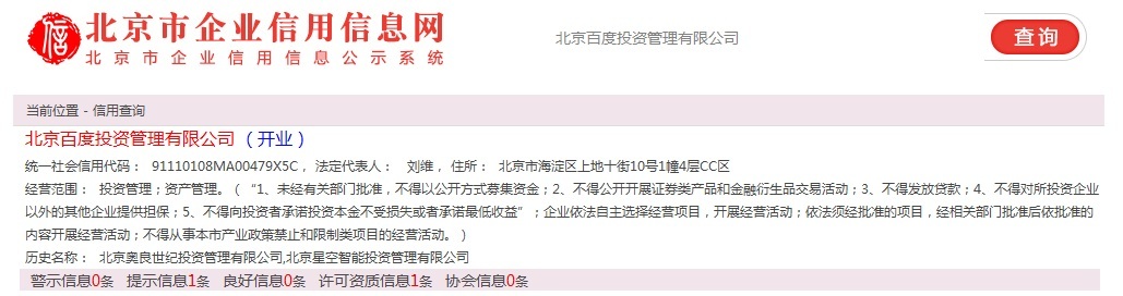 工商信息显示,北京百度投资管理有限公司成立于2016年。历史名称分别为,北京奥良世纪投资管理有限公司和北京星空智能投资管理有限公司。目前,百度投资董事长为百度风投CEO刘维。