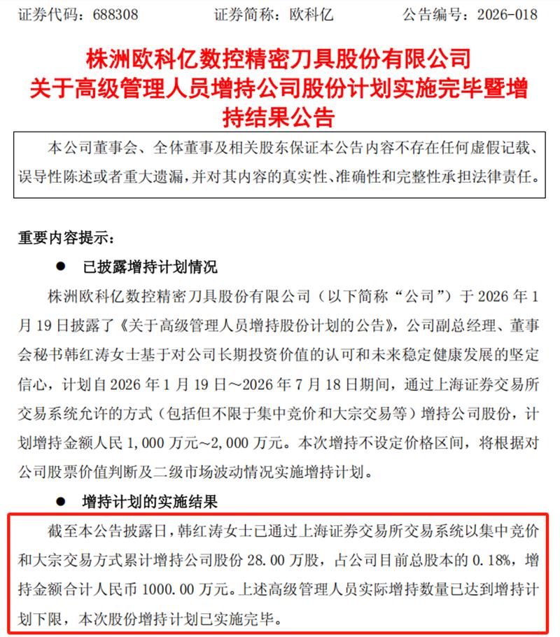 时间回溯至3个月前,2026年1月18日晚,欧科亿发布高管增持计划。