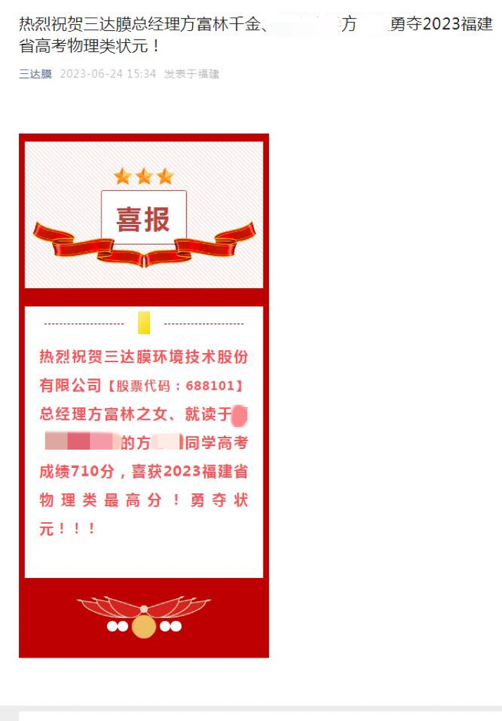 6月24日,“三达膜”公众号发文称,三达膜环境技术股份有限公司总经理方富林之女高考成绩710分,喜获2023福建省物理类最高分,勇夺状元。中新财经注意到,该公司还在文章中标注了公司的股票代码。
