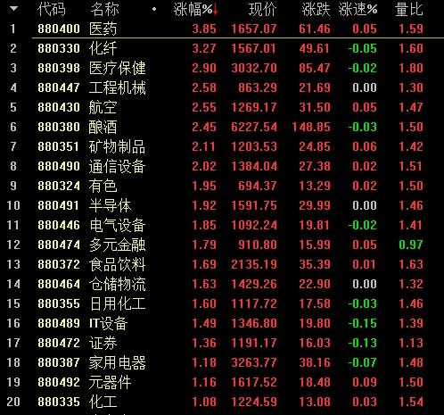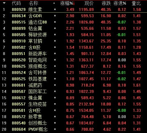 盘面上,多数行业板块飘红,医药板块领涨,亚宝药业、万泰生物、甘李药业等相关个股涨停。另外,化纤、医疗保健、工程机械、航空、酿酒等行业板块亦涨幅居前。概念板块方面,维生素、钴金属、新能源车等板块表现亮眼。