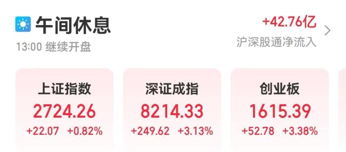 截至午间收盘,沪指涨0.82%报2724.26点;深成指涨3.13%报8214.33点;创业板指涨3.38%报1615.39点。