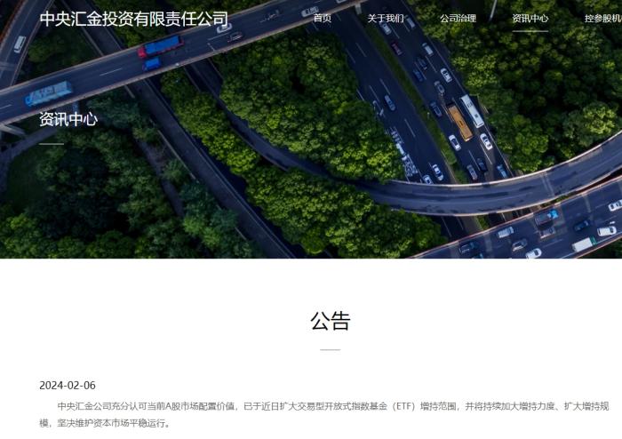 2月6日,中央汇金公司发布公告称,充分认可当前A股市场配置价值,已于近日扩大交易型开放式指数基金(ETF)增持范围,并将持续加大增持力度、扩大增持规模,坚决维护资本市场平稳运行。